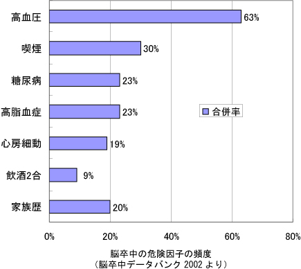 下の図は、脳卒中の患者さんの危険因子の頻度を示しています。高血圧症は64%で、高血圧症は、脳卒中最大の危険因子という事が できます。その他、喫煙、糖尿病、高脂血症なども重要なことが分かると思います。
