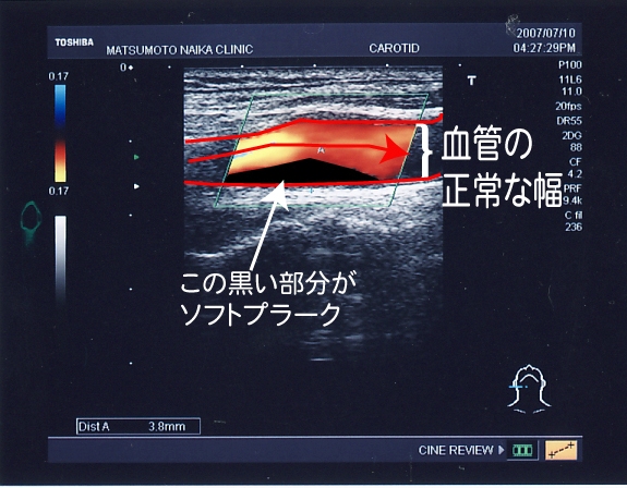 頸動脈における動脈硬化、特にプラークの有無の検査に優れています。 もし、閉塞がつよければ、脳MRI、MRAなどの追加検査が必要となります。