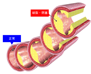 その程度によっては、血液の流れが悪くなります。詰まってしまうと、いわゆる梗塞巣ができてしまいます。 これが、脳におこれば脳梗塞、心臓であれば心筋梗塞となります。 当然非常に危険な病態です。 ところで、動脈硬化が、年齢と共に生理的に少しづつ進んで行くのは仕方ありません。しかし、その進行を早める病気があります。 高血圧症、糖尿病、脂質異常症、肥満、喫煙病などです。これらの病気を早期に発見し、治療する ことが、動脈硬化を進行させない大切な方法です。