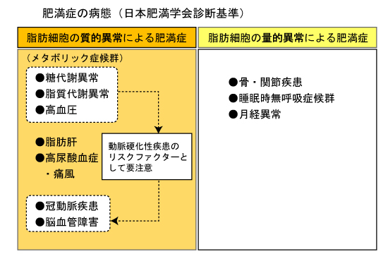 予防医学という側面から、内臓脂肪型肥満の診断、治療は重要です。 しかし、高血圧症、糖尿病、脂質異常症は、それぞれが独立した病気であり、多くはメタボリック症候群を経由して発症するのではない ことも注意していて下さい。 ところで、皮下脂肪型肥満は治療しなくてもいいのでしょうか?。糖尿病、高血圧症、脂質異常症、就寝時無呼吸症、膝関節症などを 伴っている場合は、食事療法や運動療法などの治療が必要です。 しかし、皮下脂肪型肥満は、比較的動脈硬化との関連性は低いと言われています。 ※メタボリック症候群の診断基準を記載しておきます。
