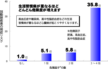 繰り返しになりますが、このような内臓脂肪型肥満があると、糖尿病、脂質代謝異常症、高血圧症などを起こしやすくなるといわれています。 下の表のように、それぞれが軽くても、リスクが集積することで、心筋梗塞や脳梗塞など心血管イベントが急激に増加するのです。